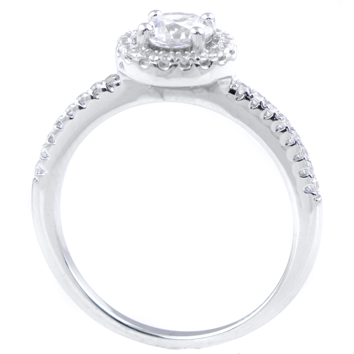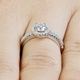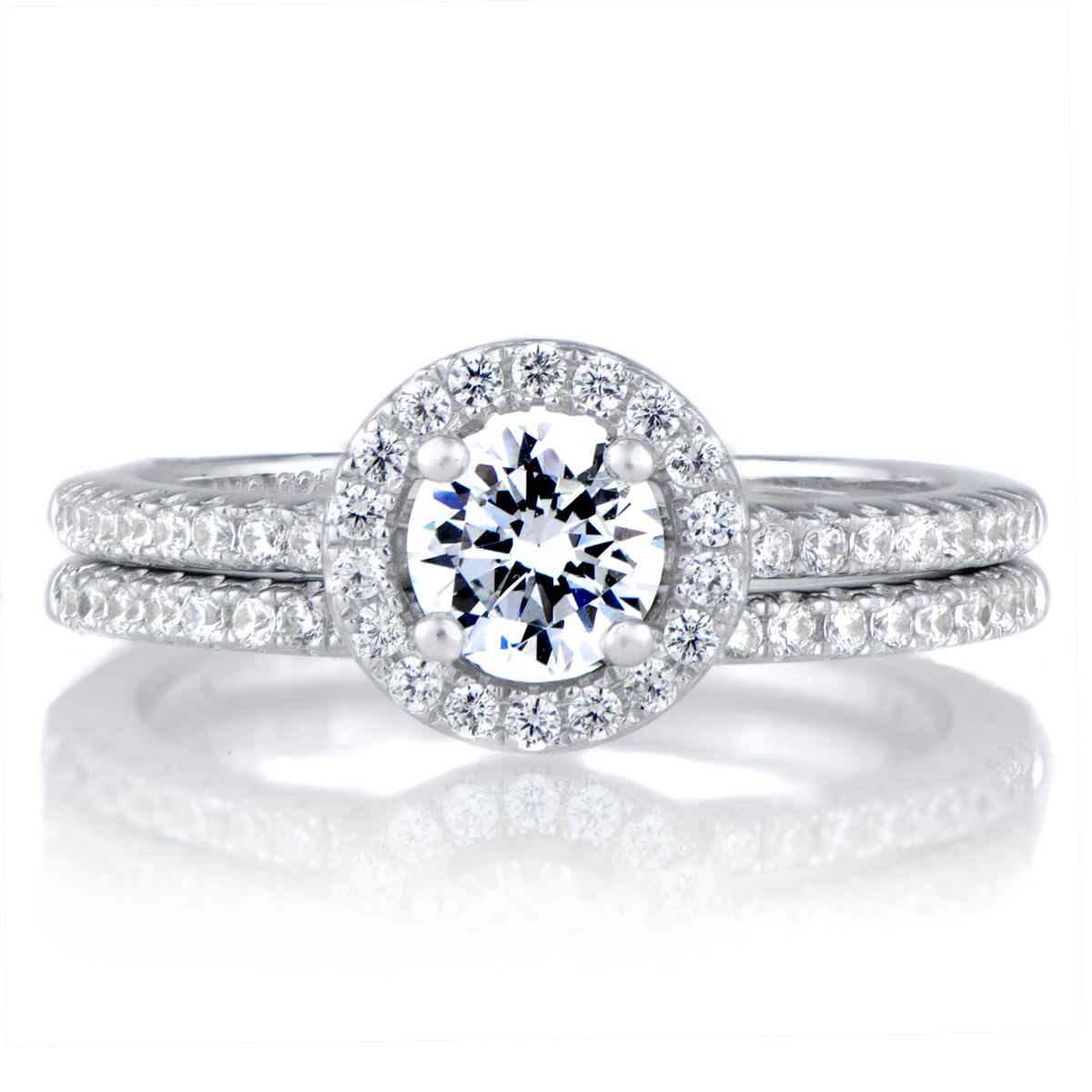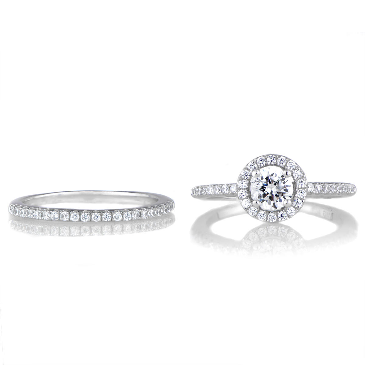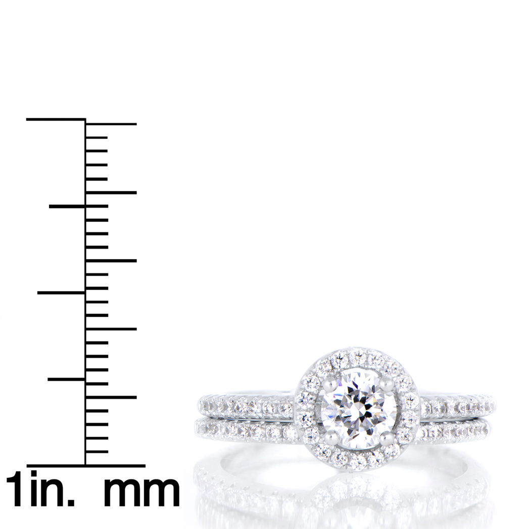- The engagement ring features a stunning .25 carat round cut CZ surrounded by a halo of smaller size CZs creating a halo-effect. The matching ring guard mirrors the engagement ring's band with a row of small round cut CZs that extend halfway down the band.