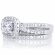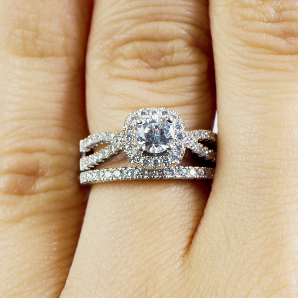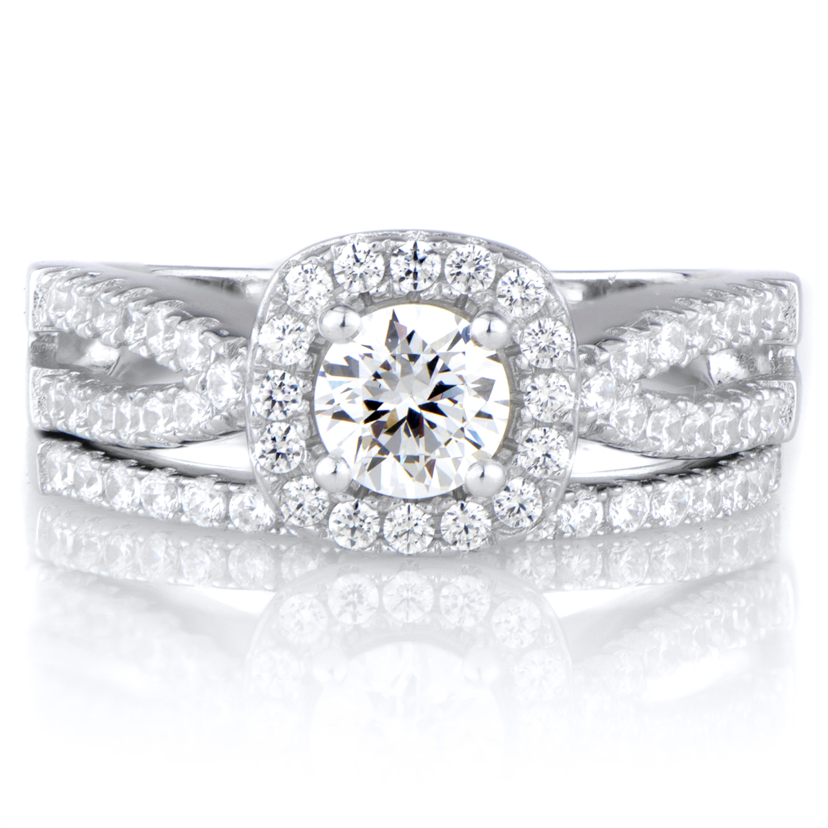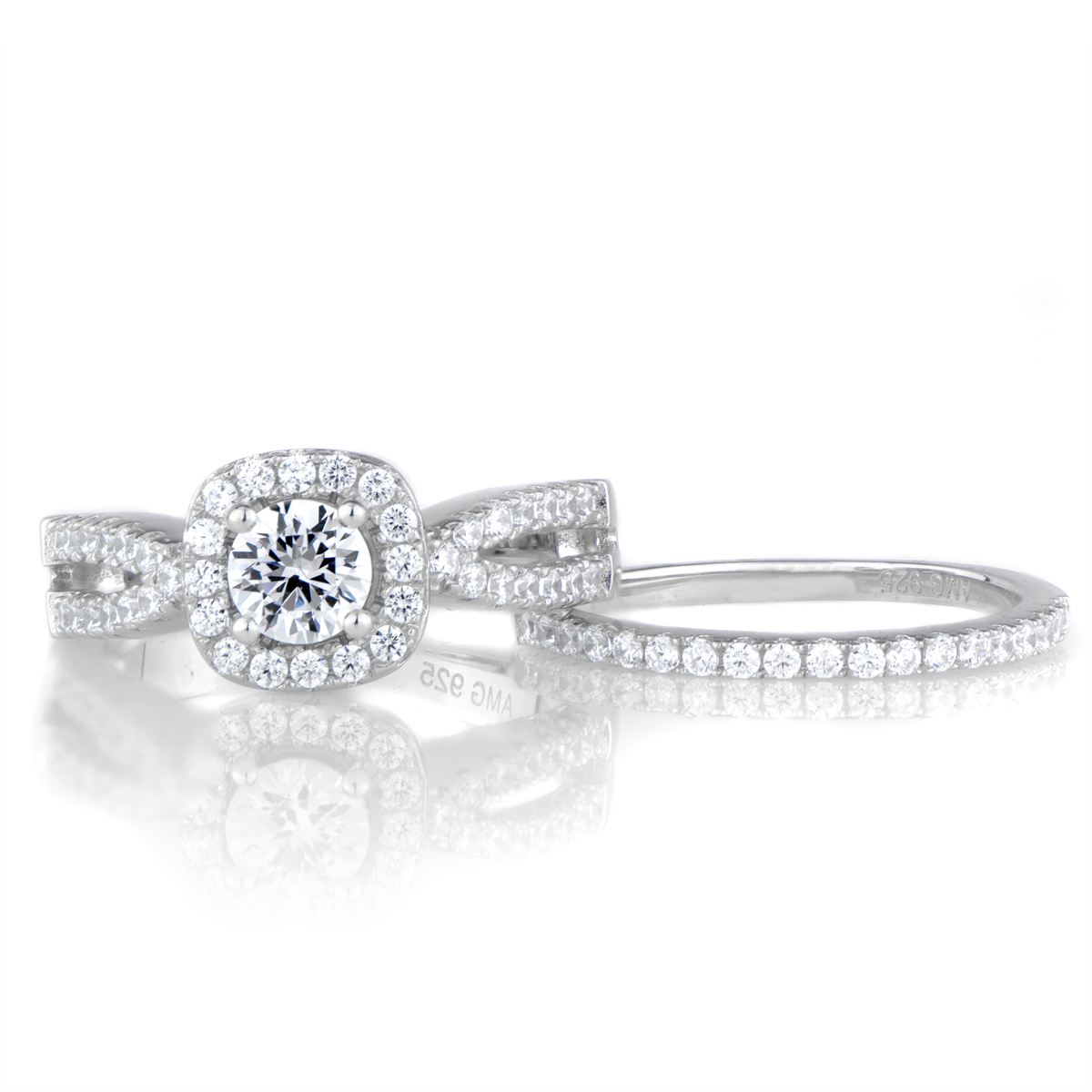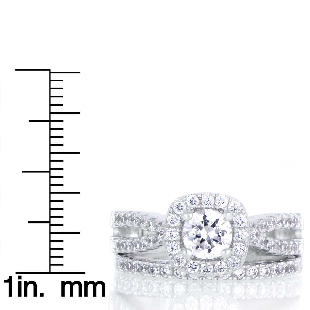 - Each ring features petite round cut CZ stones throughout. The highlight of the engagement ring is its large .46 cushion cut CZ center surrounded by a halo of smaller CZs.