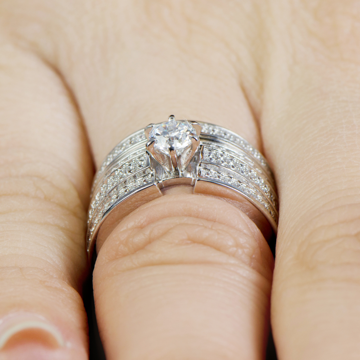 - The engagement ring features three rows of CZs surrounding a round cut CZ center stone.