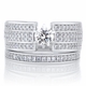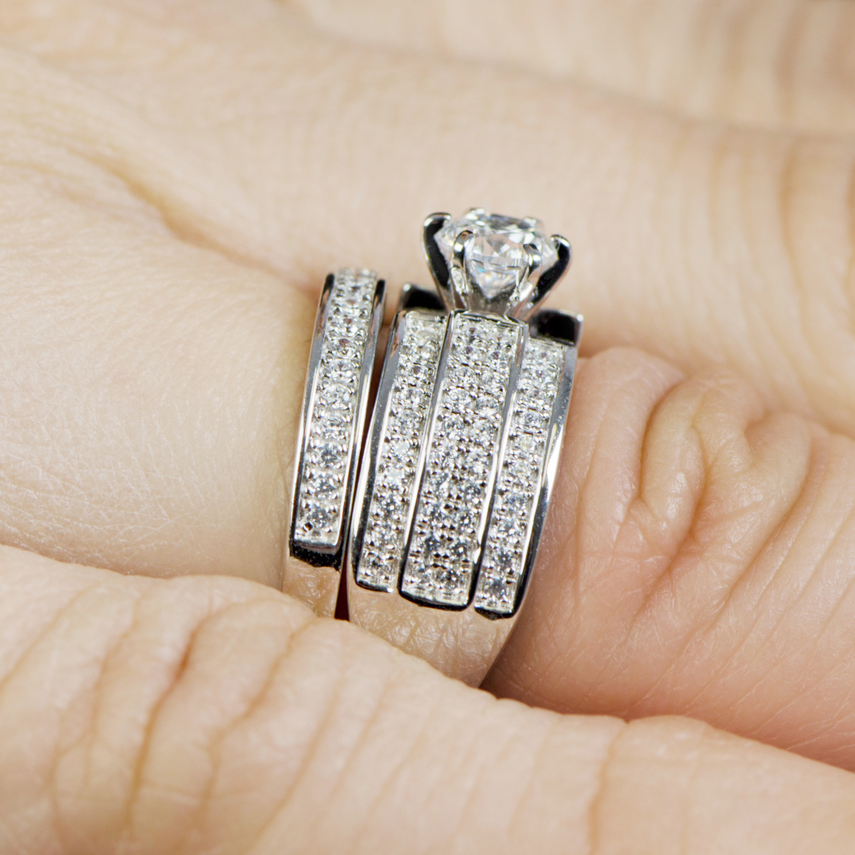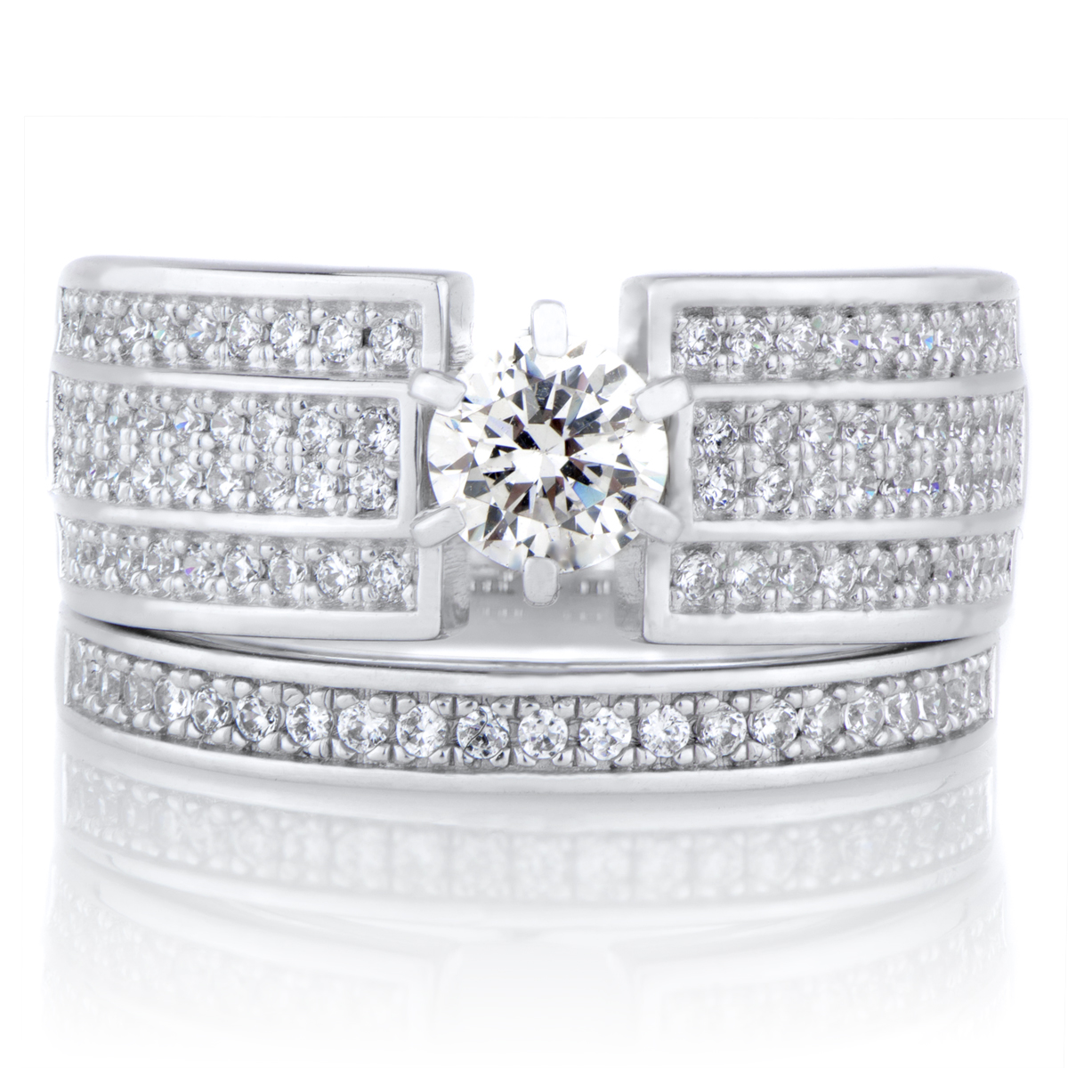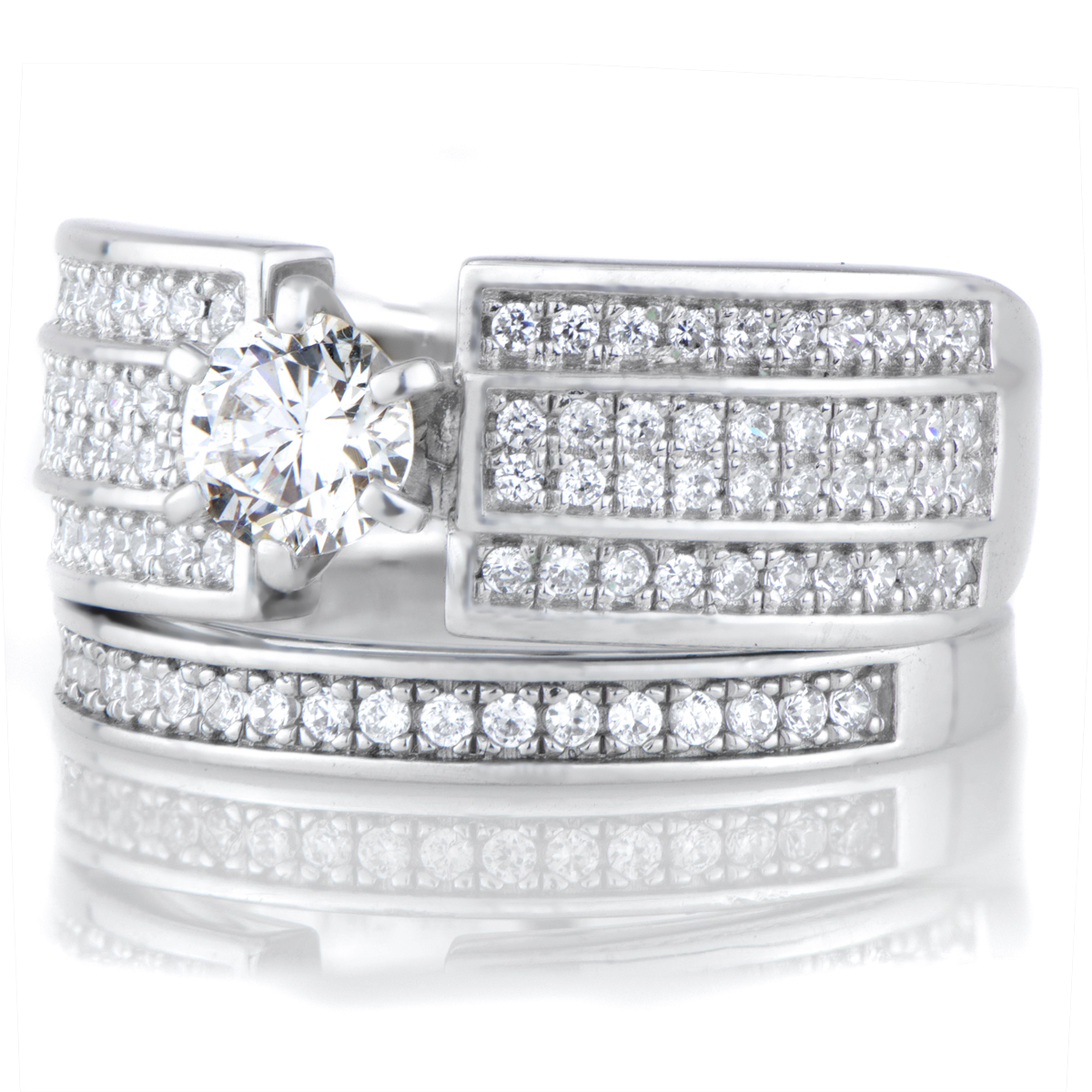 - Flashy wedding ring set with cubic zirconia. This set features a unique triple row design.