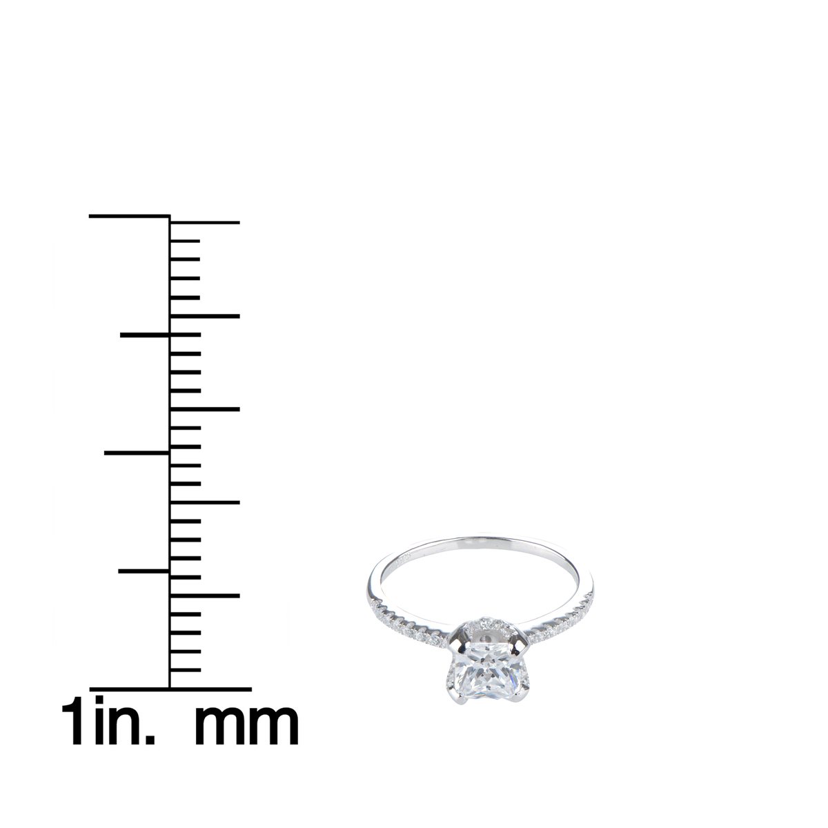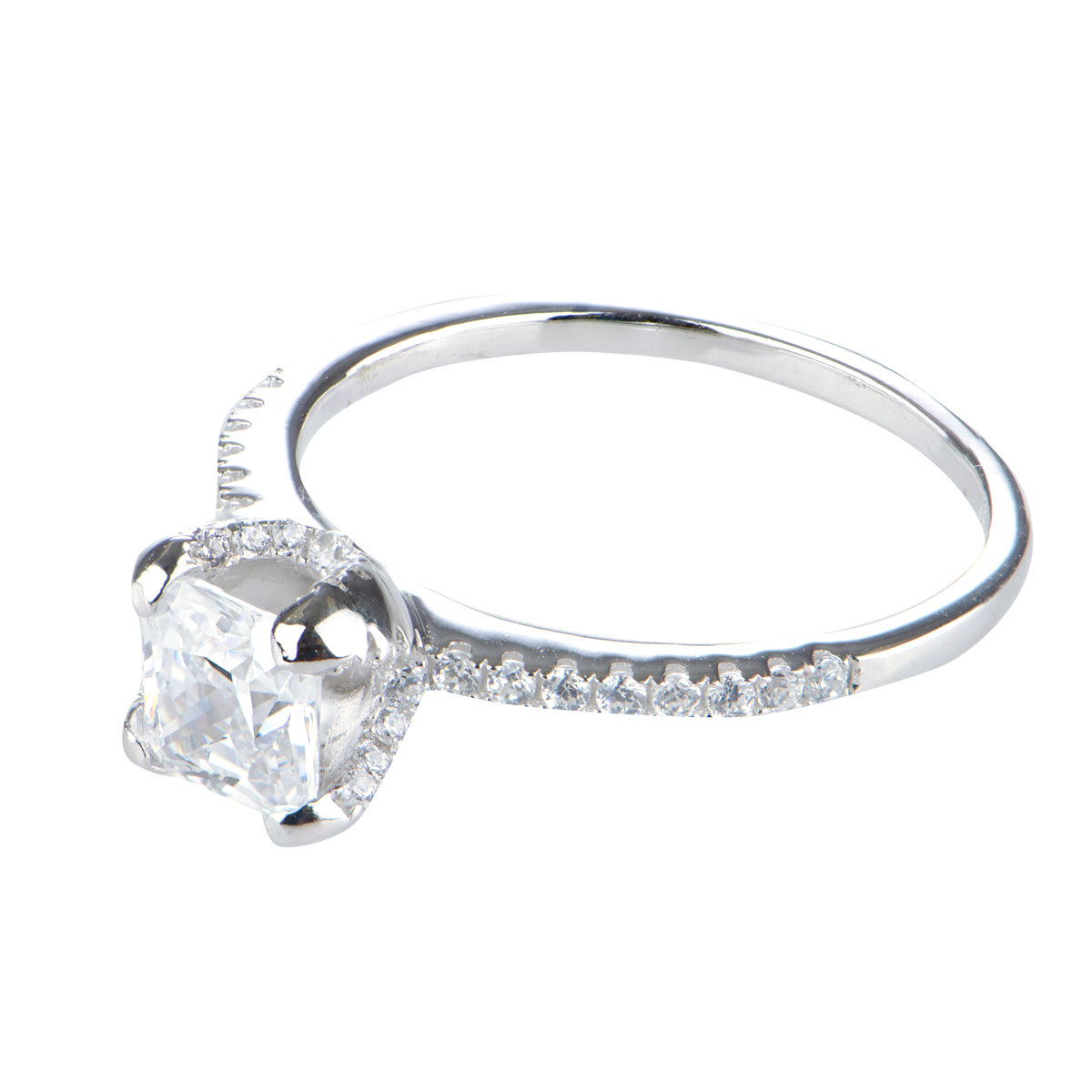 - The sterling silver engagement ring features a brilliant 1.50-carat round cut CZ center and round cut CZs that extend halfway down each side of the band.
