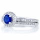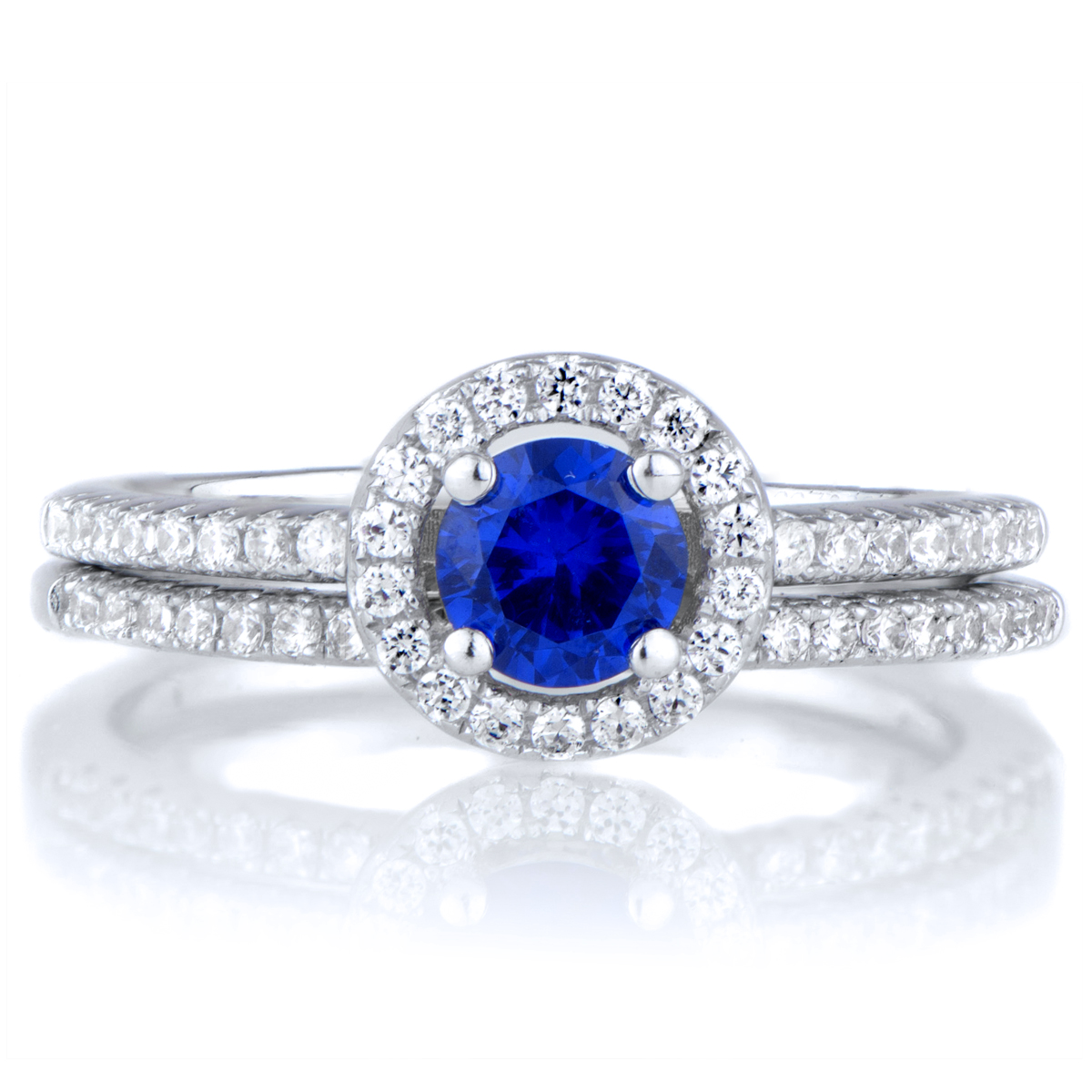 - The engagement ring features a spectacular SimulatedSapphire round cut CZ measuring .25 carats surrounded by a halo of smaller size clear CZs. The complementing ring guard features a row of petite size CZs that extend partially down the band matching the engagement ring.