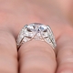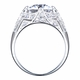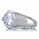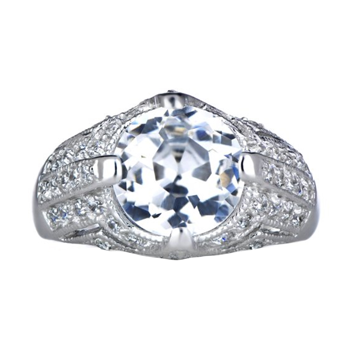 - Clusters of pave set CZs encompass the remainder of the ring over the platinum-looking sterling silver.