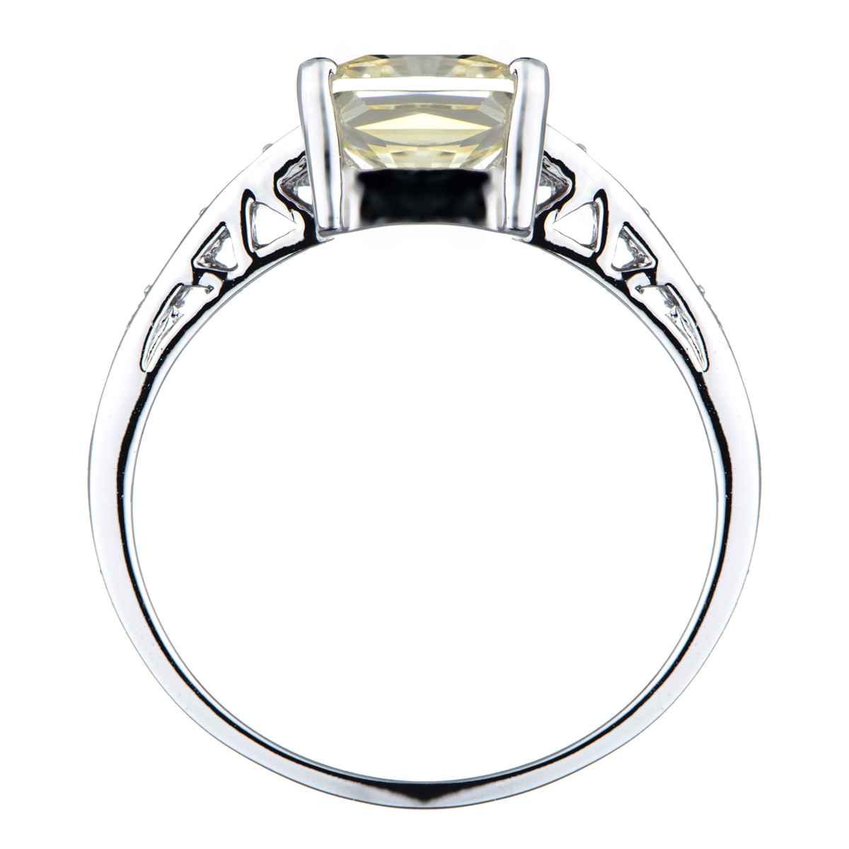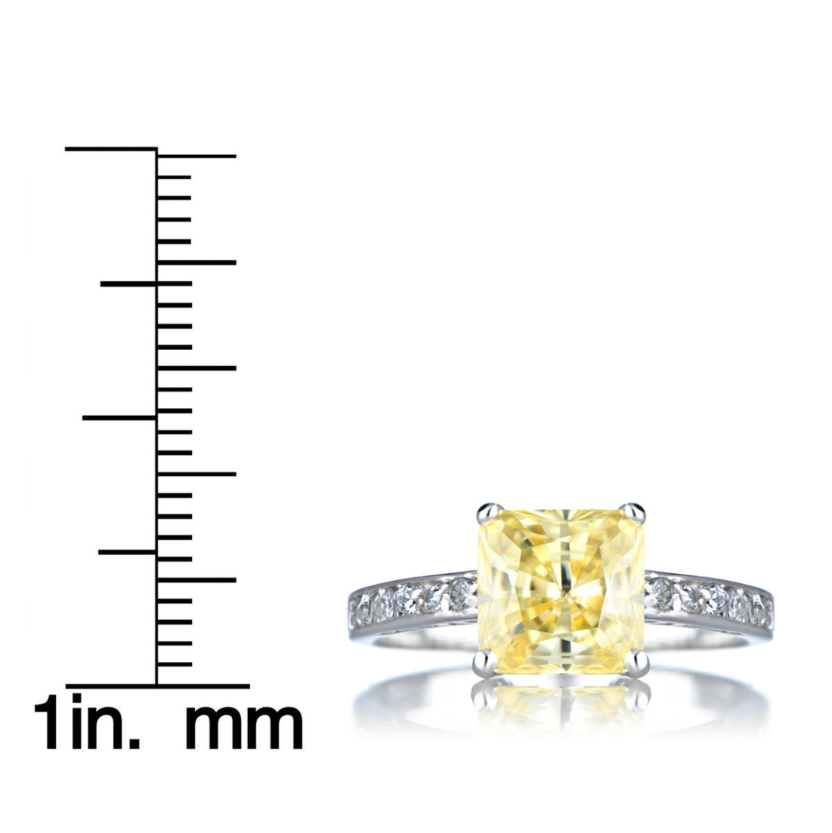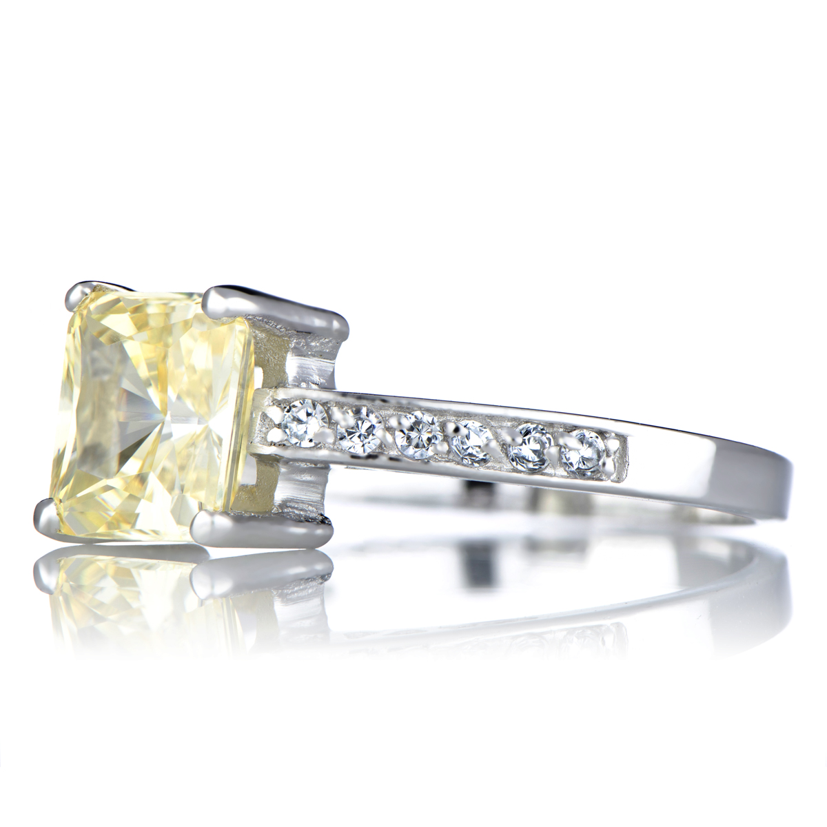 Trista's Promise Ring - Canary Princess Cut CZ is one of our best-selling rings! Victoria may have the real deal, but with a canary CZ, you can steal her Posh style! This popular cubic zirconia and sterling silver promise ring is rhodium electroplated for the sophisticated look of platinum. Trista's promise rings features a 2.5 carat princess cut canary colored cubic zirconia center stone, and a band of inlaid, prong set round cut CZs. The entire promise ring weighs 5.9 grams.
