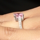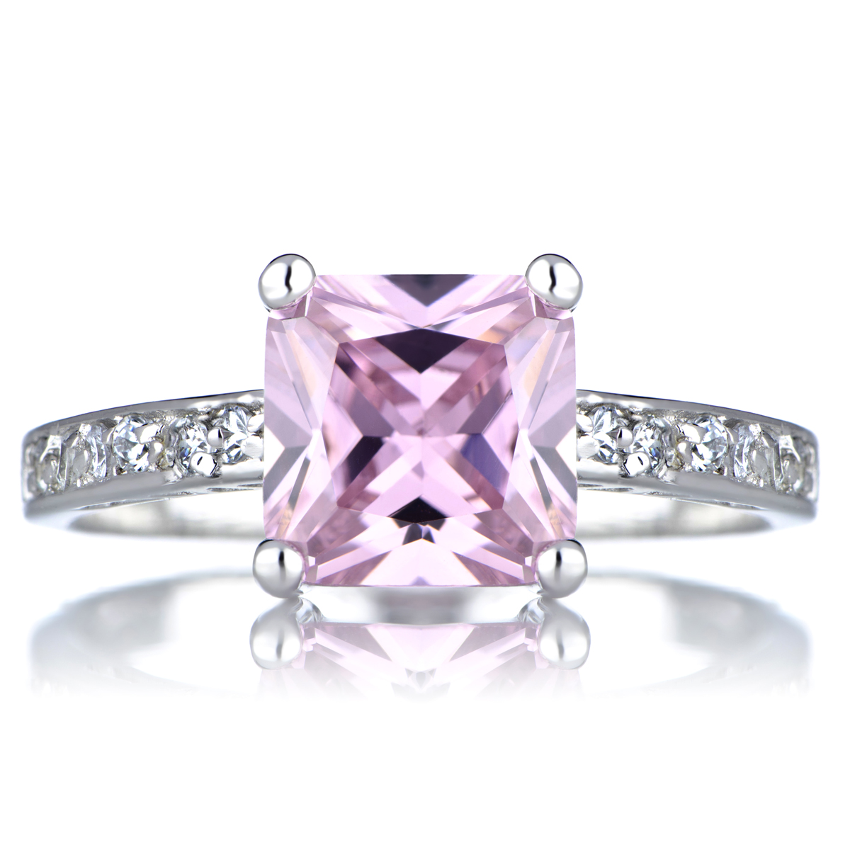 Trista's Promise Ring - Pink Princess Cut CZ is one of our best-selling rings! This popular cubic zirconia and sterling silver promise ring is rhodium electroplated for the sophisticated look of platinum. Trista's promise ring features a 2.5 carat princess cut, pink cubic zirconia center stone, and a band of inlaid, prong set round cut CZs. The entire CZ promise ring weighs 5.9 grams. Emitations will donate 25% of the profits from our breast cancer awareness items to the Breast Cancer Research Foundation!