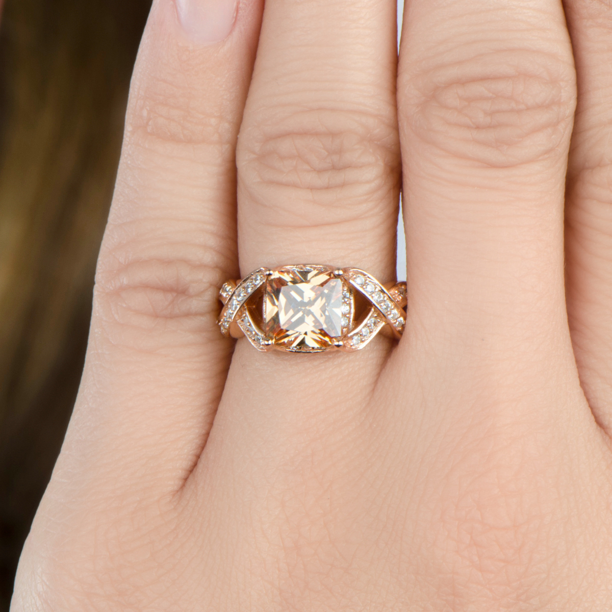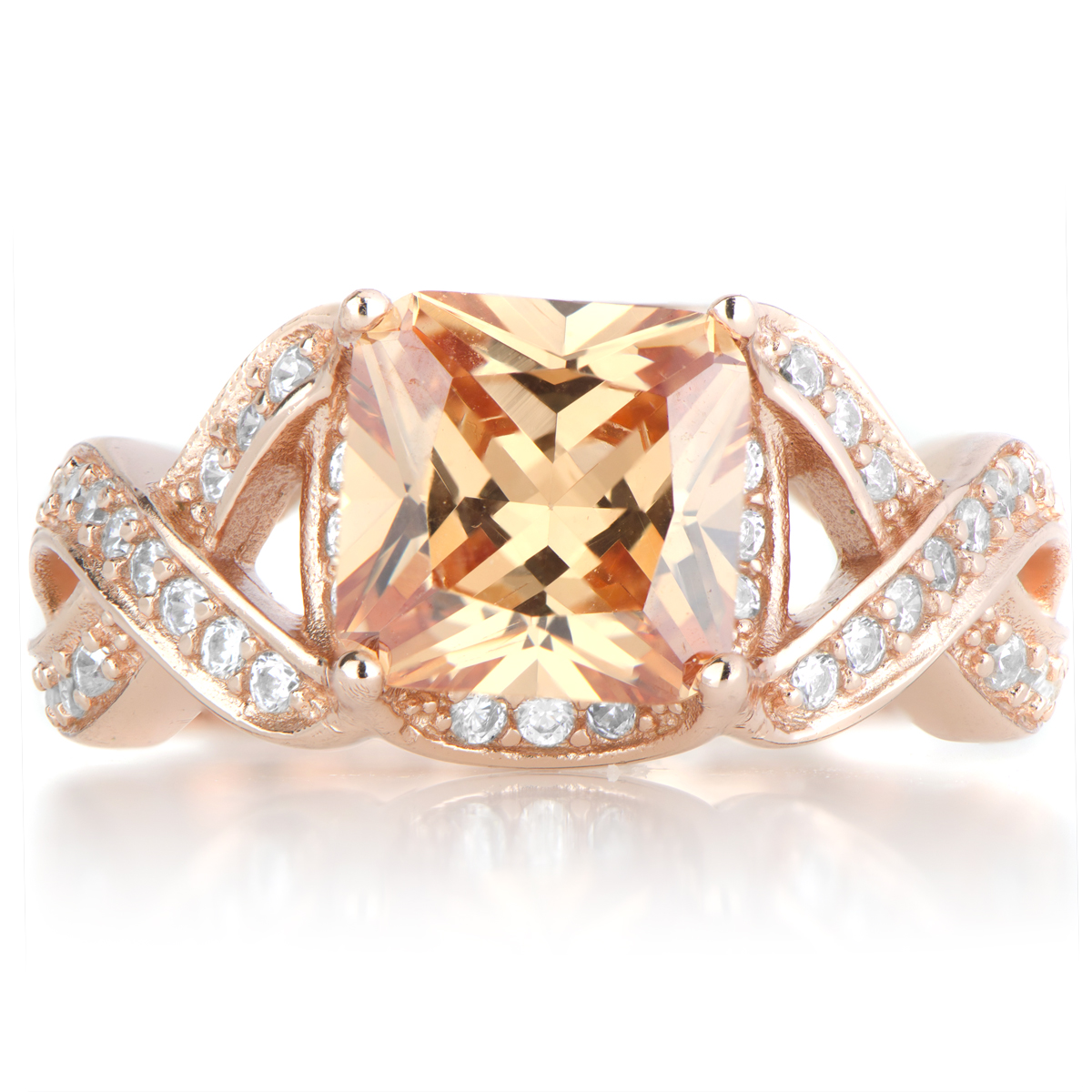 In addition to the soft and rich princess cut champagne center stone, the criss cross band features petite size round CZs.