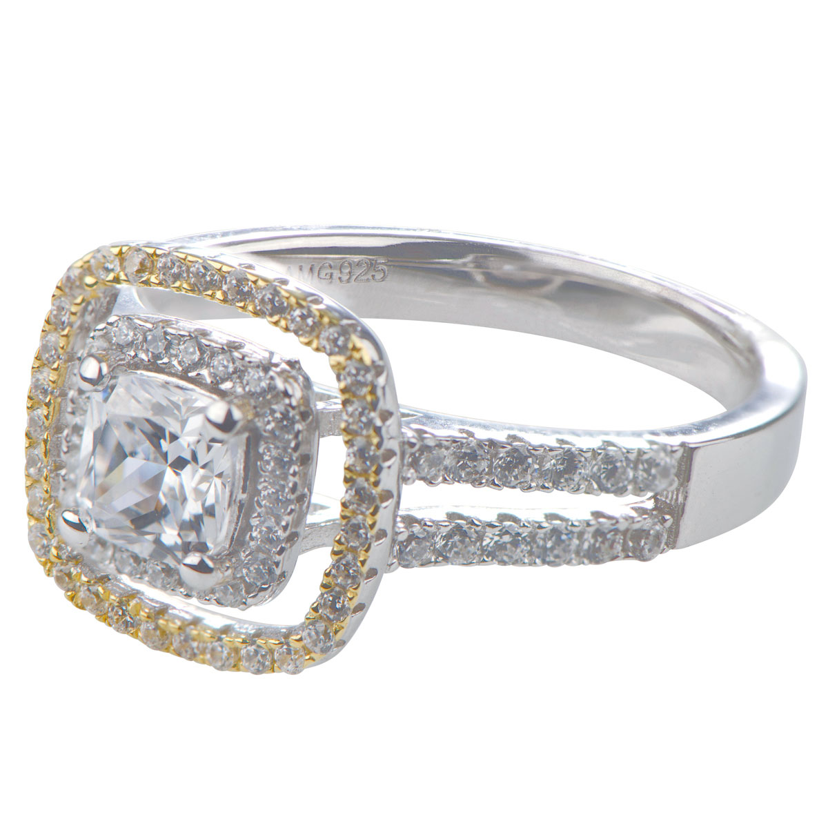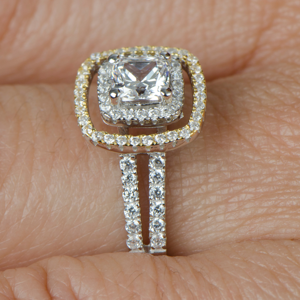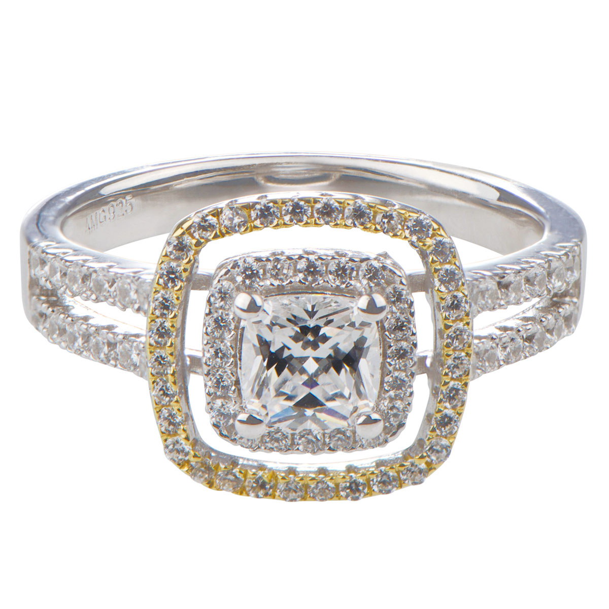 - The .84 carat cushion cut center stone is framed by a double halo of round cut cz's with just a hint of goldtone on the outer halo. This ring is .925 sterling silver and the band is approx. 12 mm thick.