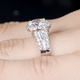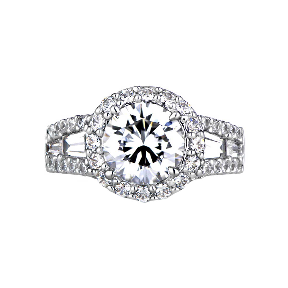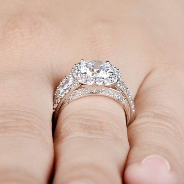 - The stunning CZ center blings brightly at 2.5 carats. Shimmering baguette cut CZs line each side of the band and tiny round cut stones accent the larger stones.