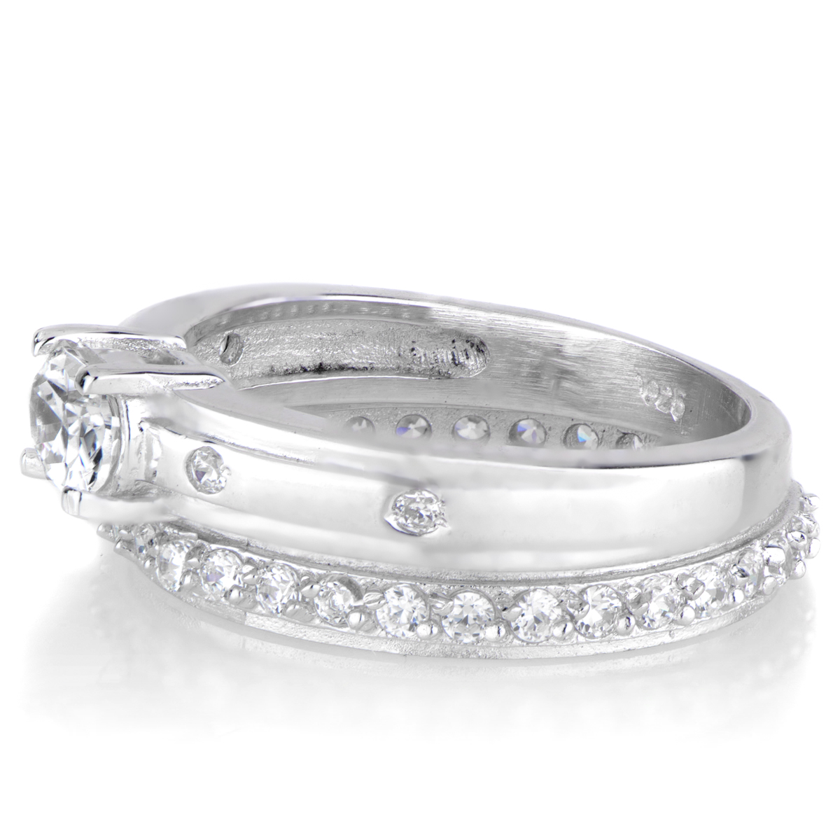 - Tiny round cut CZs surround the guard band for extra sparkle.
