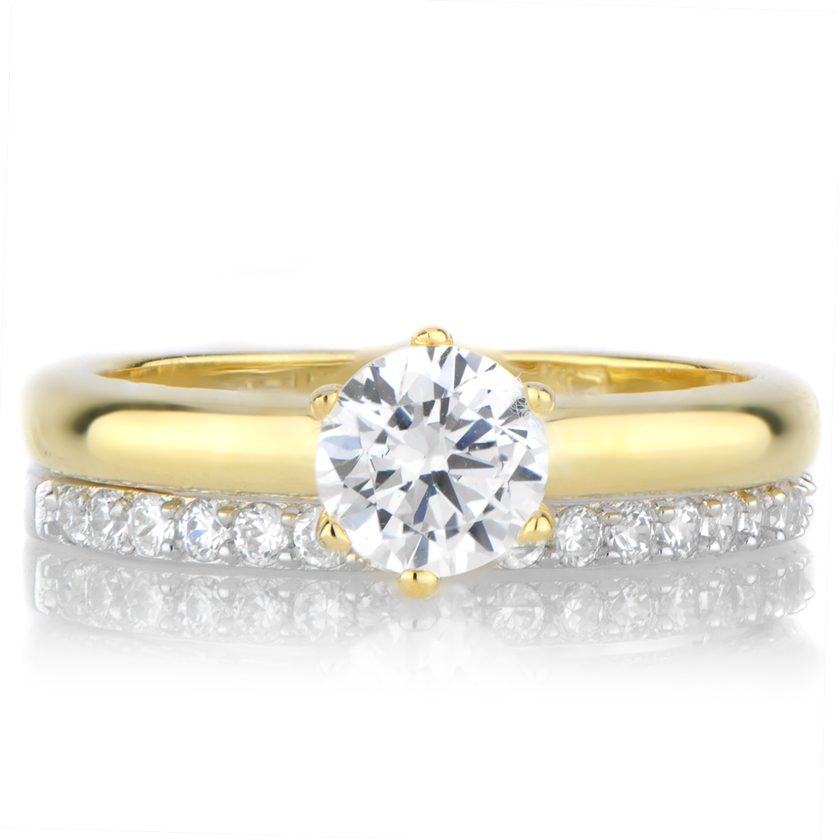 Thank you for your inquiry. This ring is sterling silver, gold plated, and features cubic zirconia stones. You can review this information by scrolling down to 'Product Details' on the product page.